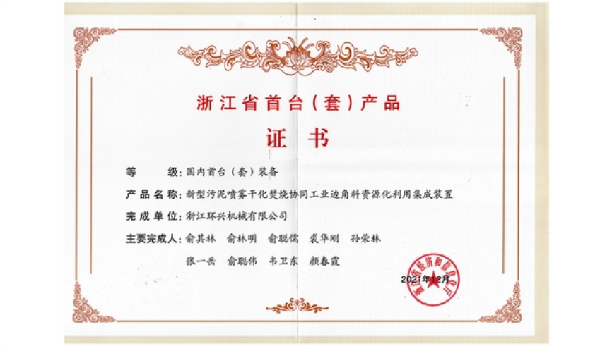 目前,環興機械已建成近30條污泥噴霧干化焚燒生產線,污泥處理工程規模達8000噸/天。2021年,企業獲評國家級專精特新“小巨人”企業。同時,新型污泥噴霧干化焚燒裝置被評為國內首臺(套)裝備,目前正在申報國際首臺(套)裝備,相關技術和設備已進入浙江、安徽、江蘇、山東、內蒙古等全國市場,以及孟加拉國等國際市場。