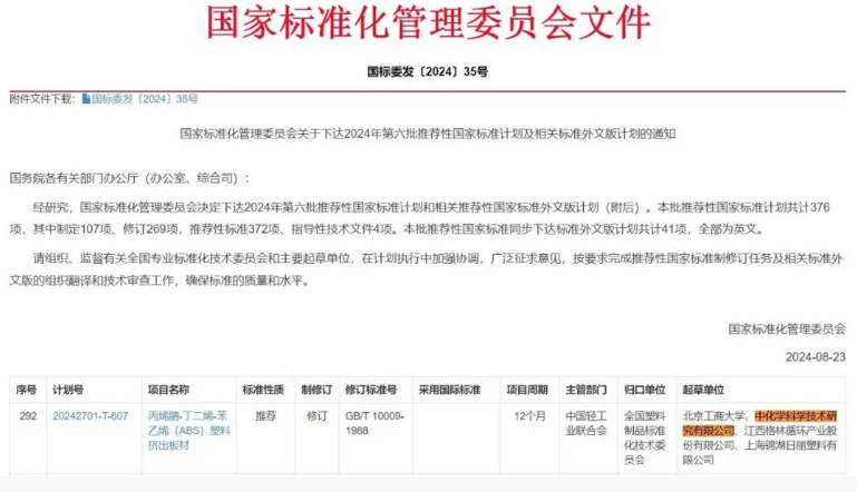 | 近日,國家標(biāo)準(zhǔn)化管理委員會公布2024年第六批推薦性國家標(biāo)準(zhǔn)計(jì)劃,中國化學(xué)所屬科研院參與的國家標(biāo)準(zhǔn)修訂項(xiàng)目——“丙烯腈-丁二烯-苯乙烯(ABS)塑料擠出板材”項(xiàng)目獲批立項(xiàng)。  丙烯腈-丁二烯-苯乙烯(ABS)樹脂為五大合成樹脂之一,其抗沖擊性、耐熱性、耐低溫性、耐化學(xué)藥品性及電氣性能優(yōu)良,廣泛應(yīng)用于機(jī)械、汽車、電子電器、儀器儀表、紡織和建筑等工業(yè)領(lǐng)域。本次修訂是對原標(biāo)準(zhǔn)中的技術(shù)要求、試驗(yàn)參數(shù)等指標(biāo)進(jìn)行更新,修訂實(shí)施后將滿足現(xiàn)有行業(yè)的技術(shù)需求和性能指標(biāo)要求。 下一步,中國化學(xué)將按照《國家標(biāo)準(zhǔn)化發(fā)展綱要》要求,聯(lián)合業(yè)內(nèi)參與單位深入研究化工新材料市場現(xiàn)狀及未來趨勢,共同開展相關(guān)標(biāo)準(zhǔn)研究、標(biāo)準(zhǔn)制定等工作,提高化工新材料領(lǐng)域的標(biāo)準(zhǔn)化水平,為我國化工新材料行業(yè)高質(zhì)量發(fā)展貢獻(xiàn)中國化學(xué)智慧和力量。 原標(biāo)題:《中國化學(xué)參與的國家標(biāo)準(zhǔn)修訂項(xiàng)目獲批立項(xiàng) | 打贏企業(yè)發(fā)展“陣地戰(zhàn)”》 |